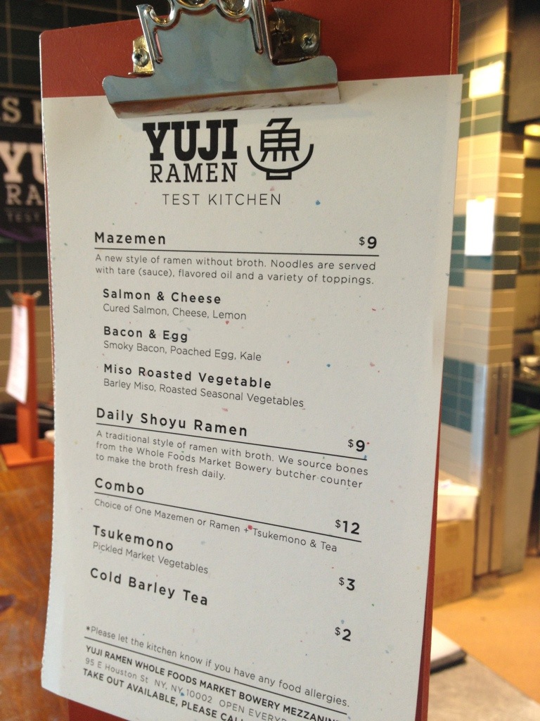 I had Yuji’s mazemen at Smorgasburg last September and immediately fell in love with the brothless noodles. Right now chef Yuji Haraguchi has a test kitchen at Whole Foods Market (Bowery) on Houston. The test kitchen is only going to be there for a few months until his restaurant opens in Williamsburg this summer.