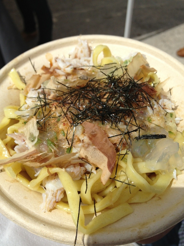I finally got to try Keizo Shimamoto’s ramen burger on Saturday at Smorgasburg! My friends and I got there at about 10:00AM and then got the burger at about 11:30AM. There were about 60 people ahead of us in line.