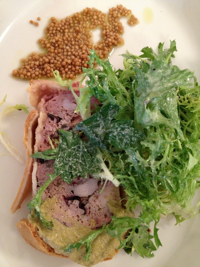 We ordered clam chowder (amazing), beef tartare sandwich (SO good and reminded me of a fatty tuna sushi roll), the frisée with lardons (just OK and came with a little green caterpillar in the greens), and the rabbit terrine (also amazing).